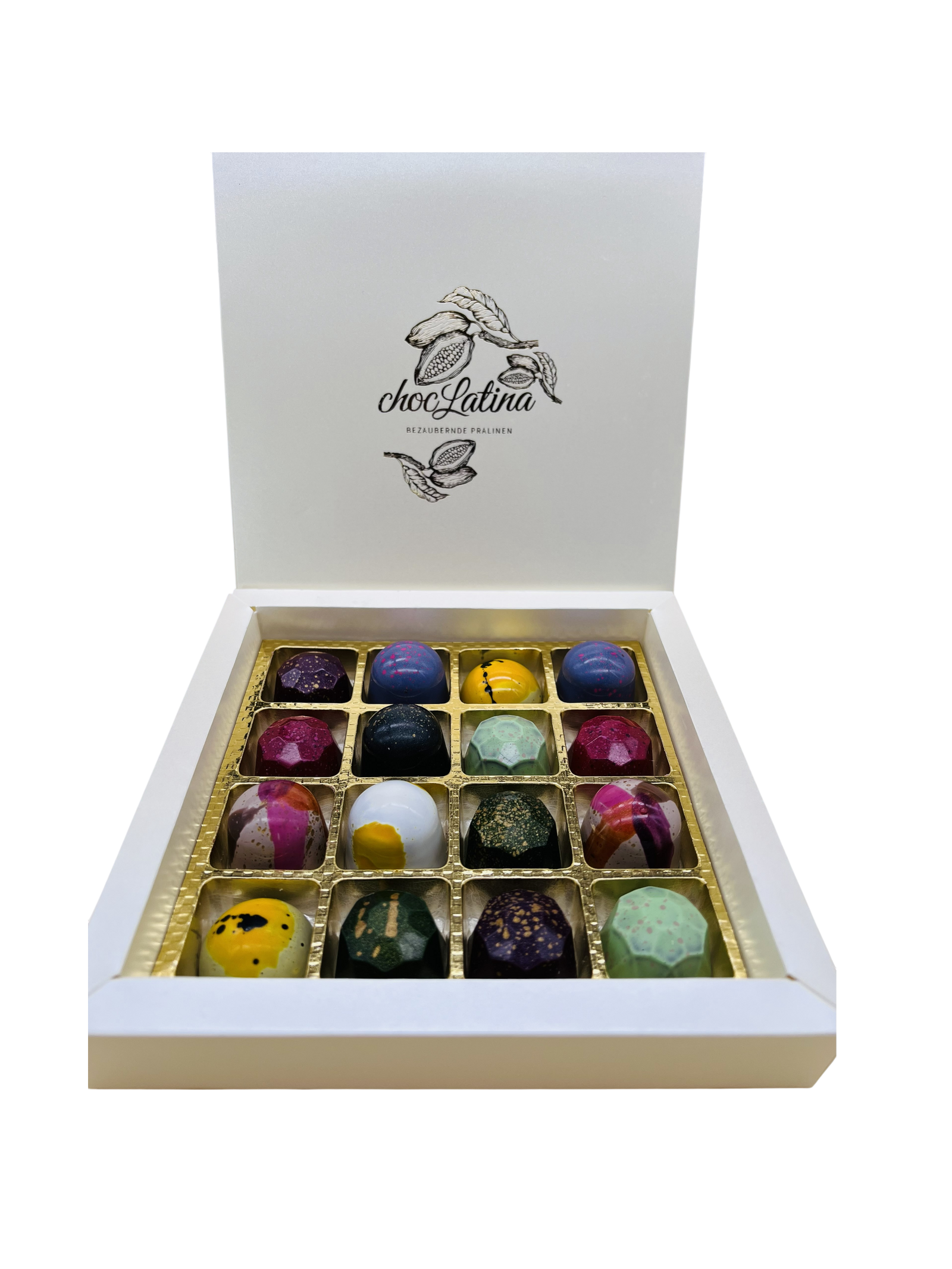 16 handgemachte Pralinen, jede mit einer eigenen Persönlichkeit – kunstvoll gestaltet, zart schmelzend und mit ganz viel ChocLatina-Magie.