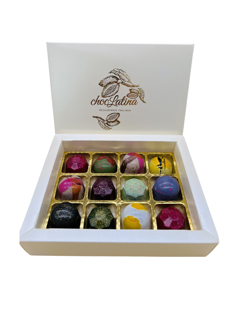 Zwölf handgefertigte Meisterwerke, vereint in einer eleganten Box. Jede Praline erzählt ihre eigene Geschmacksgeschichte – von klassisch-nussig bis überraschend-fruchtig, von sanft-süß bis fein-würzig.